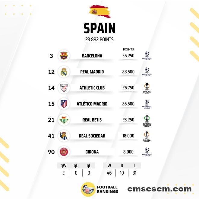 北京时间6月6日,数据机构 Football Rankings 公布了2024/25赛季西班牙俱乐部的欧战积分排名。巴塞罗那以36.250分高居西班牙第一,在全欧排名第3位,紧随其后的是皇家马德里、毕尔巴鄂竞技和马德里竞技。