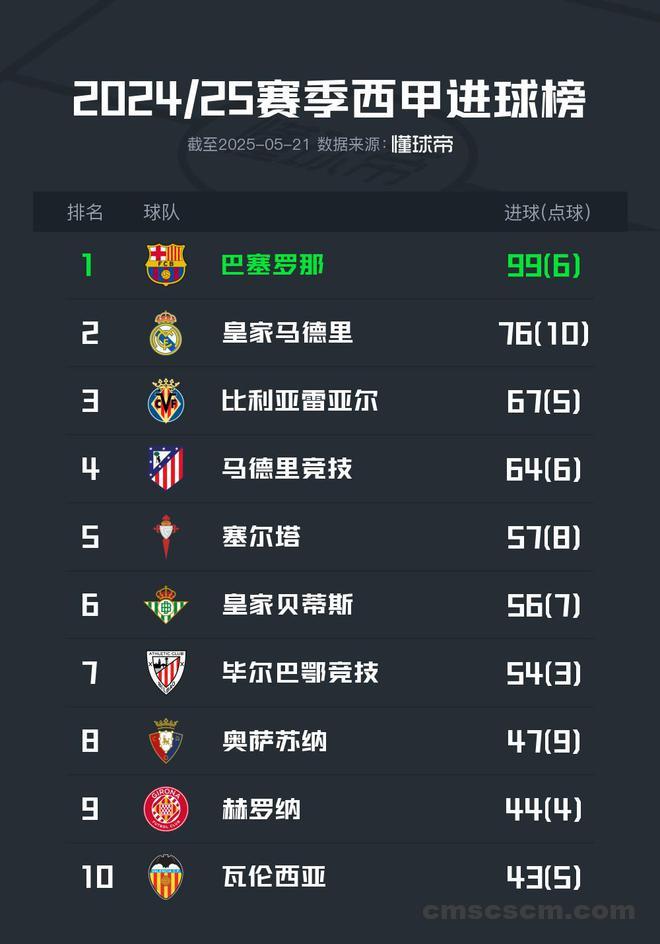 本赛季西甲联赛中,巴萨已经打入99球,在最后一轮对阵毕尔巴鄂竞技的比赛中,有望打入赛季联赛第100球,成为五大联赛唯一进球破百的球队。