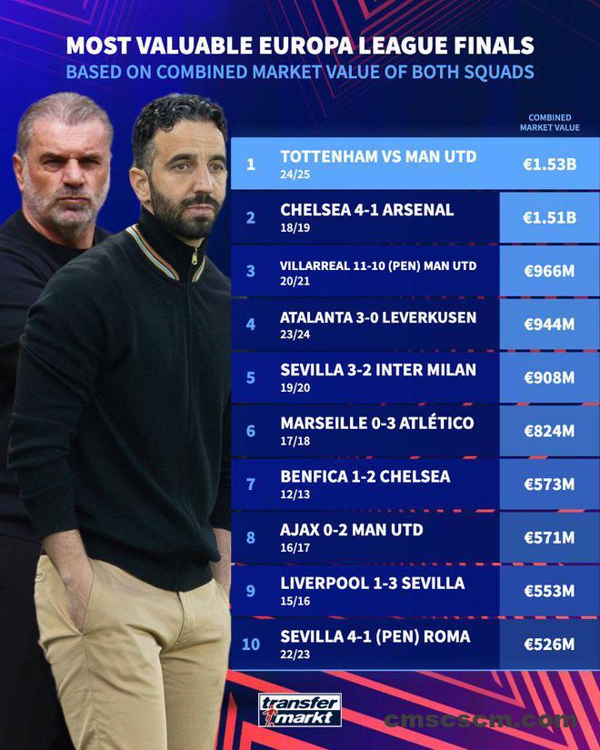 今夜,热刺vs曼联的欧联决赛将在圣马梅斯球场打响。赛前,德国转会市场统计了历史上两队总身价最高的欧联杯决赛对阵排行。