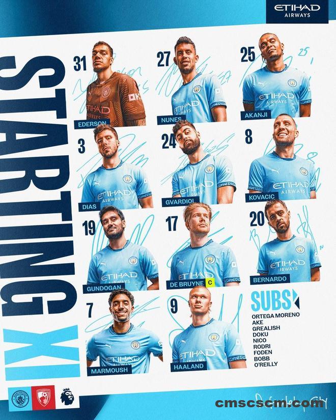 英超第37轮,曼城将主场对阵伯恩茅斯,曼城队史英超7次主场对阵伯恩茅斯全部取胜。