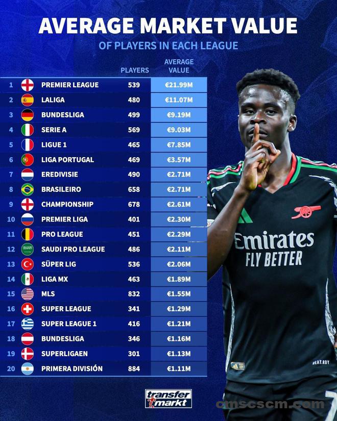 北京时间5月20日,德国转会市场列出了各联赛球员平均市场价值排行榜,其中英超以2199万欧居首,西甲排名第二,德甲排名第三。