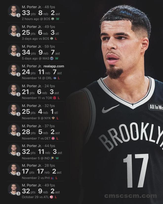 自从离开掘金,很少看到小迈克尔-波特的新闻。其实他最近打得不错,过去8场比赛,小波特在篮网场均砍下27.8分7.5篮板3.3助攻,投篮命中率50.3%,三分命中率40.6%。赛季至今,小波特打了14场比赛,其中5场砍下30+!