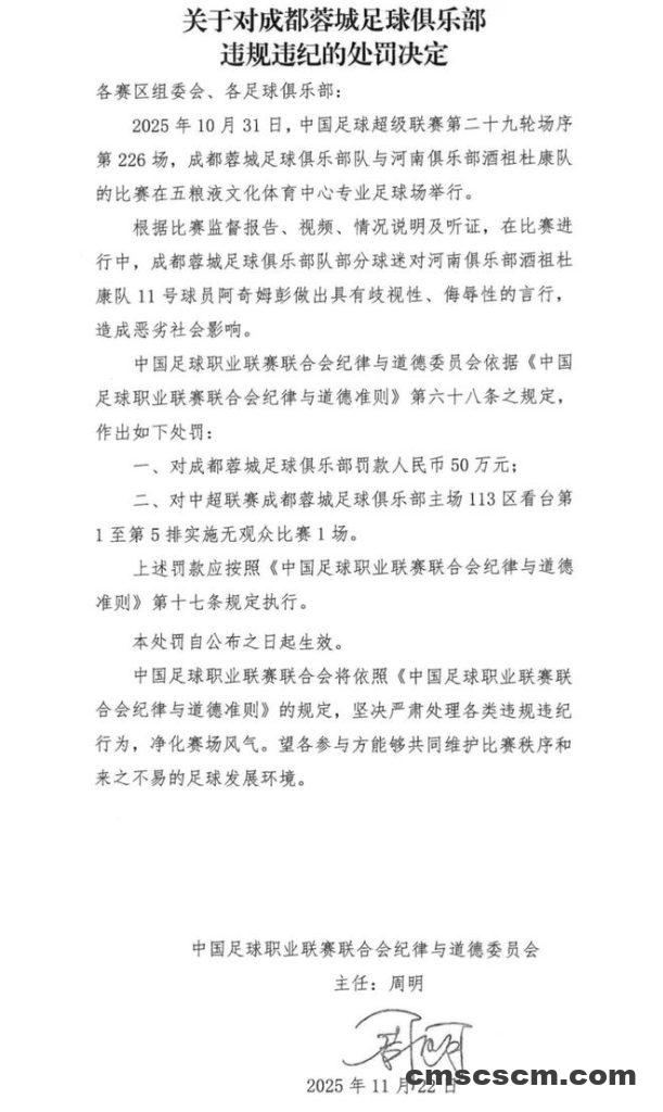 中足联官方发布公告,因成都队部分球迷对阿奇姆彭有歧视侮辱言行,对成都蓉城俱乐部罚款50万元,对其中超联赛主场113区看台前五排实施无观众比赛一场。
