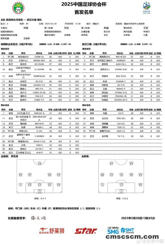 直播吧05月20日讯 足协杯第3轮今日下午拉开帷幕,陕西联合vs武汉三镇,赛前双方公布首发。