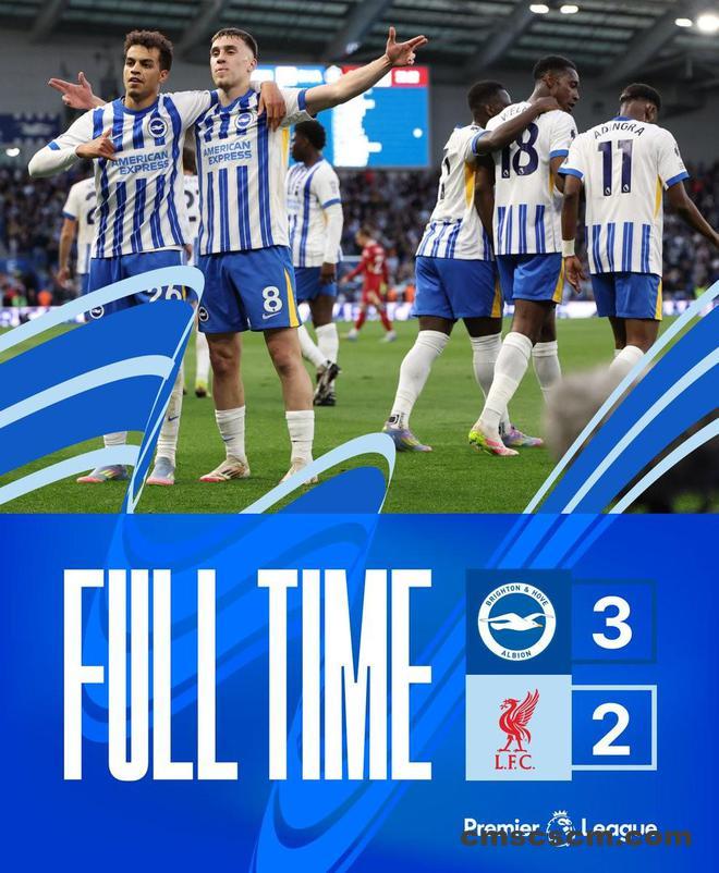 英超第37轮,布莱顿主场3-2逆转击败利物浦,至此,布莱顿本赛季英超主场对阵BIG6保持不败,战绩为5胜1平。