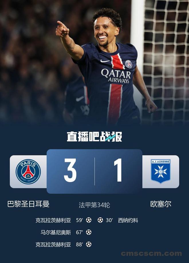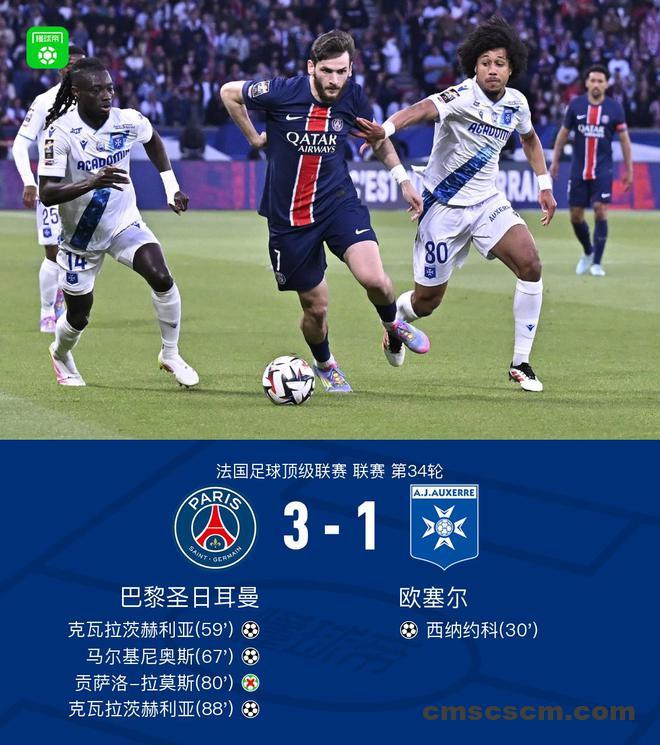 直播吧5月18日讯 北京时间3:00,法甲第34轮巴黎圣日耳曼vs欧塞尔,比赛在王子公园球场打响!上半场,西纳约科帮助欧塞尔率先破门!努诺-门德斯任意球中框。下半场,克瓦拉茨赫利亚远射扳平,马尔基尼奥斯头球反超!贡萨洛-拉莫斯失点,克瓦拉茨赫利亚双响锁定胜局!最终,巴黎3-1逆转击败欧塞尔。