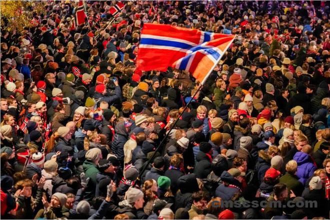 在挪威队4-1击败意大利队的比赛结束第二天,当地时间周一晚上,挪威队的球员们齐聚挪威市政厅。