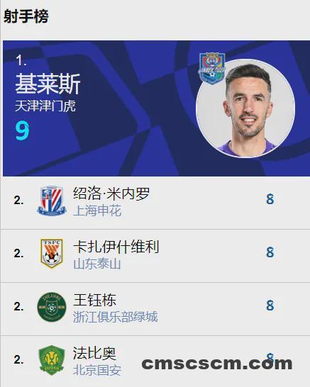 中超前13轮比赛战罢,上海申花在积分榜上确立了2分的领先优势,成都蓉城、北京国安紧随其后。而在射手榜上,津门虎外援基莱斯在经历了4轮的进球荒之后,最近3轮比赛连进2球,再度甩开身后众人以9粒进球的成绩领跑中超射手榜。不过,基莱斯可不敢再有怠慢,身后的米内罗、瓦科、王钰栋和法比奥都有8粒进球,他们随时可以追平甚至反超自己。
