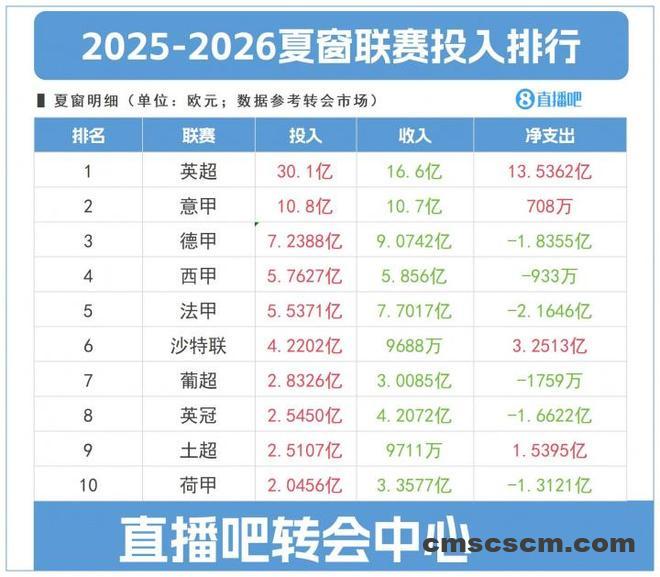夏窗关闭倒计时2天14小时,英超已投入超30亿=意甲+德甲+西甲+法甲的投入总额。