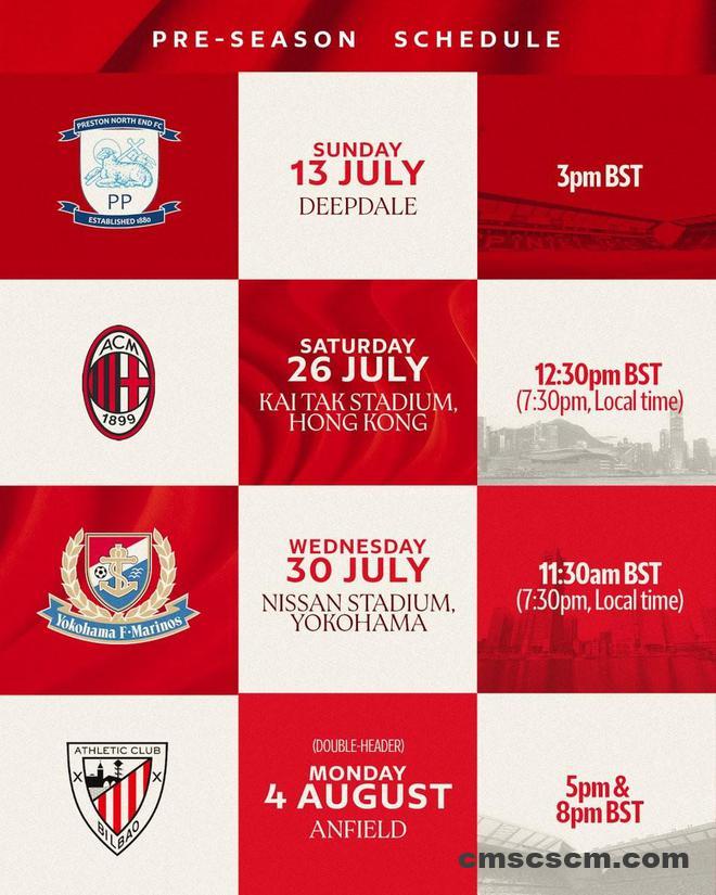 北京时间6月13日,英超冠军利物浦公布了2025-2026赛季的季前赛赛程,他们将先后对阵普雷斯顿、AC米兰、横滨水手以及毕尔巴鄂竞技。