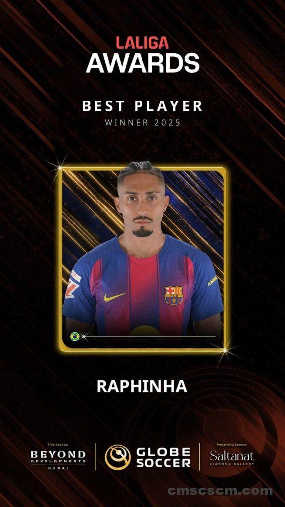 北京时间12月28日,2025年度环球足球奖颁奖典礼在迪拜举行,其中,拉菲尼亚获得了2025年度最佳西甲球员奖。