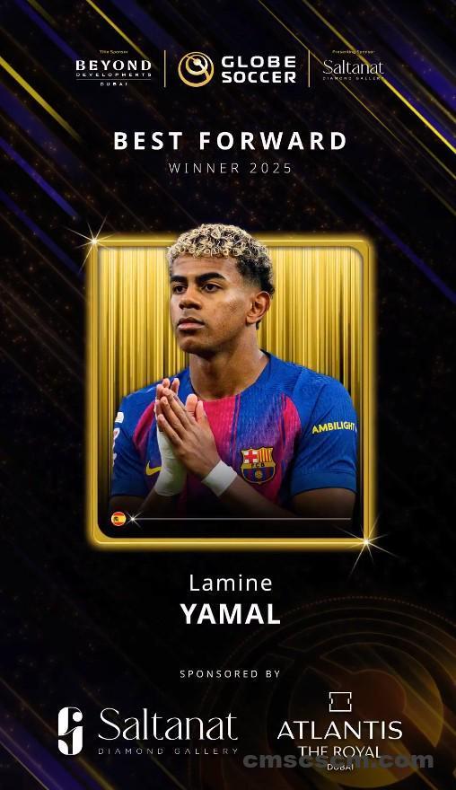 北京时间12月29日,环球足球奖官方宣布,巴塞罗那的锋线球星亚马尔当选他们评出的2025年最佳前锋。