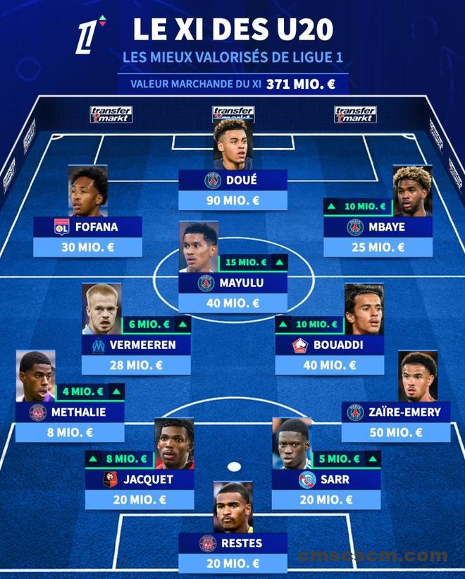 北京时间12月17日,在更新了法甲球员的身价之后,德转列出了法甲最贵的U20球员11人阵容,巴黎圣日耳曼4人入选,杜埃9000万欧元身价领衔。