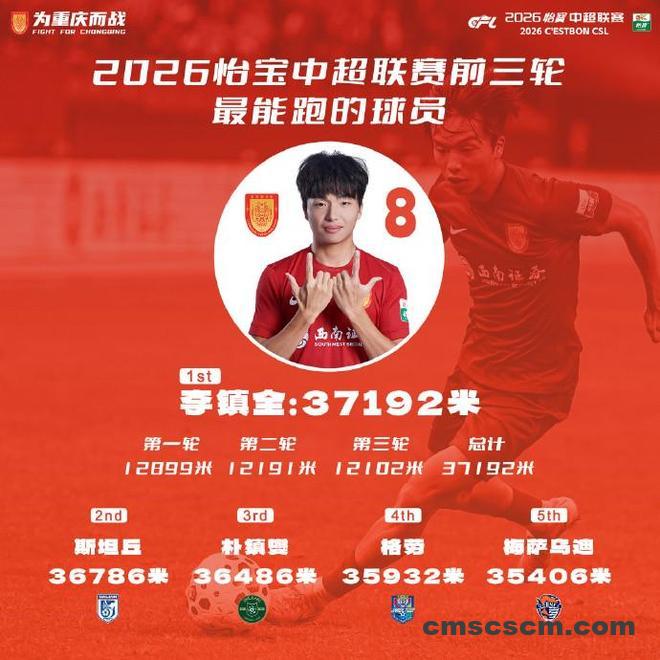 北京时间4月1日,中超统计出了新赛季联赛前三轮跑动距离最长的五名球员,重庆铜梁龙中场李镇全以3场比赛超37000米的跑动距离排名第一,大连英博外援斯坦丘排名第二,浙江外援朴镇燮排名第三。