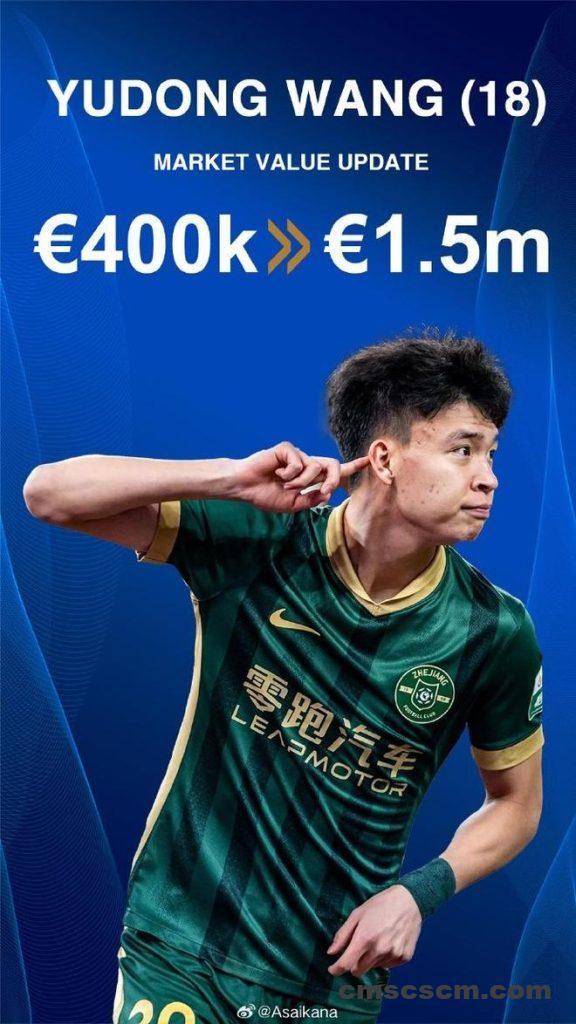 周四,《转会市场》更新中超球员身价,王钰栋身价从40万暴涨至150万欧元,在中国球员里仅次于塞尔吉尼奥(170万欧元)。