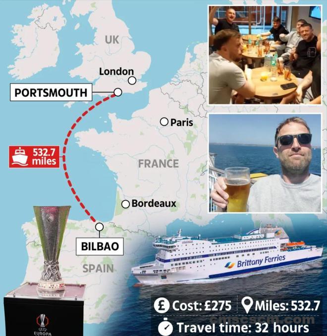 根据《太阳报》的消息,为观看欧联杯决赛,数百名曼联、热刺球迷选择耗时32小时的渡轮奔赴毕尔巴鄂。这趟周日22点从朴茨茅斯启程、周二8点抵港的航程票价约260英镑(含舱位),成为天价机票外的无奈之选。
