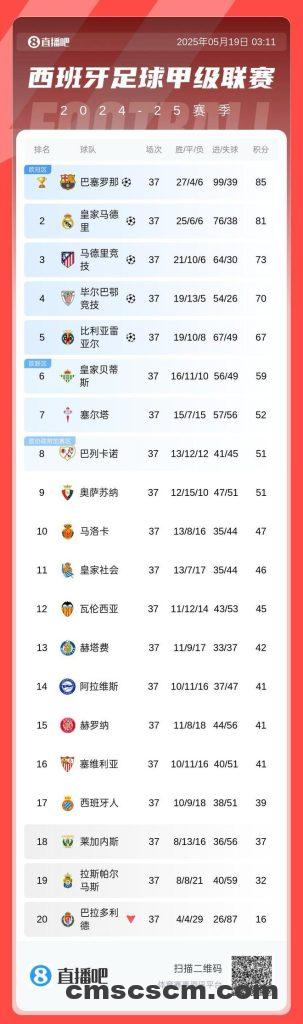 直播吧05月19日讯 西甲第37轮,比利亚雷亚尔3-2战胜巴萨锁定欧冠资格。皇马2-0塞维利亚,马竞4-1贝蒂斯。