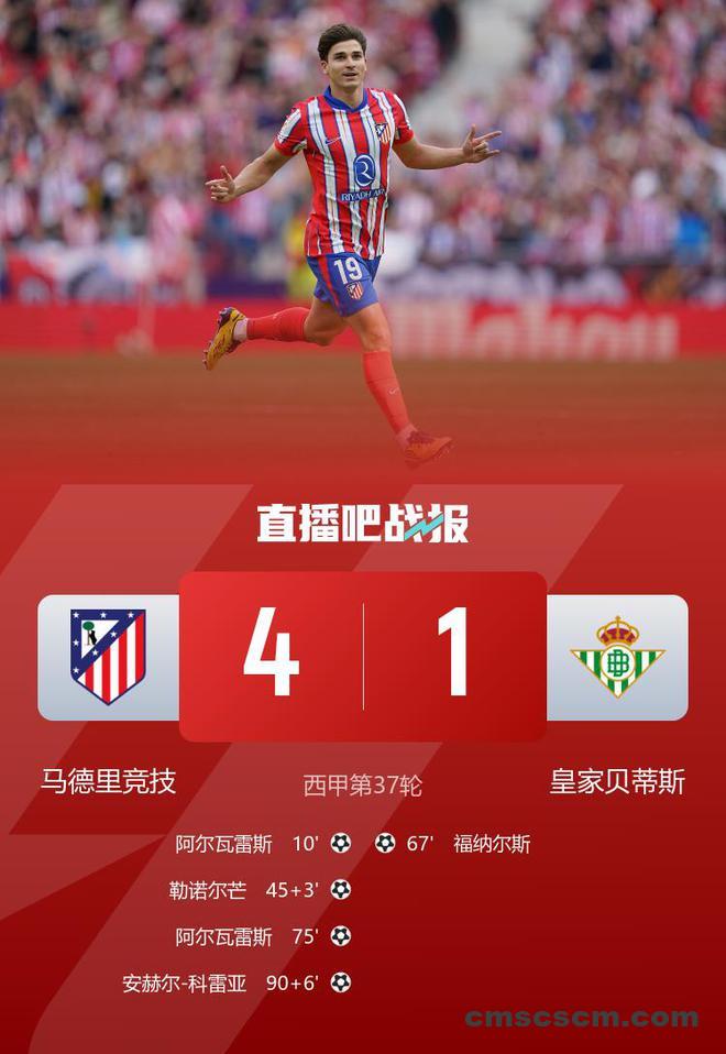 直播吧5月19日讯 北京时间5月19日凌晨1时整,2024-25赛季西甲第37轮在利雅得航空大都会球场展开角逐,马德里竞技主场迎战皇家贝蒂斯。上半场阿尔瓦雷斯任意球超级世界波+中柱,勒诺尔芒处子球,索尔洛特屡失良机,下半场福纳尔斯扳回一城,阿尔瓦雷斯2射1传,格列兹曼替补助攻,科雷亚锦上添花。最终马竞主场4-1战胜贝蒂斯,贝蒂斯联赛3轮不胜。积分榜方面,马竞积73分仍居第3,贝蒂斯积59分名列第6,距前五8分+无缘欧冠资格。