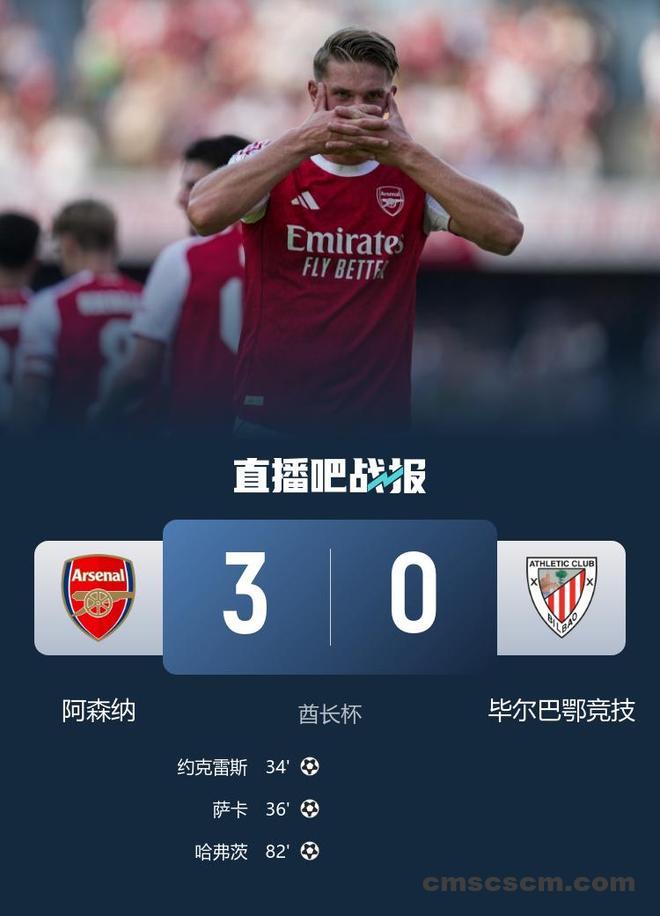 直播吧8月10日讯 北京时间00:00,酋长杯阿森纳vs毕尔巴鄂竞技,比赛在酋长球场打响!上半场,阿森纳2分钟2球,约克雷斯、萨卡破门!下半场,约克雷斯鱼跃冲顶中柱;萨卡助攻哈弗茨单刀破门!全场比赛结束,阿森纳3-0战胜毕尔巴鄂竞技。