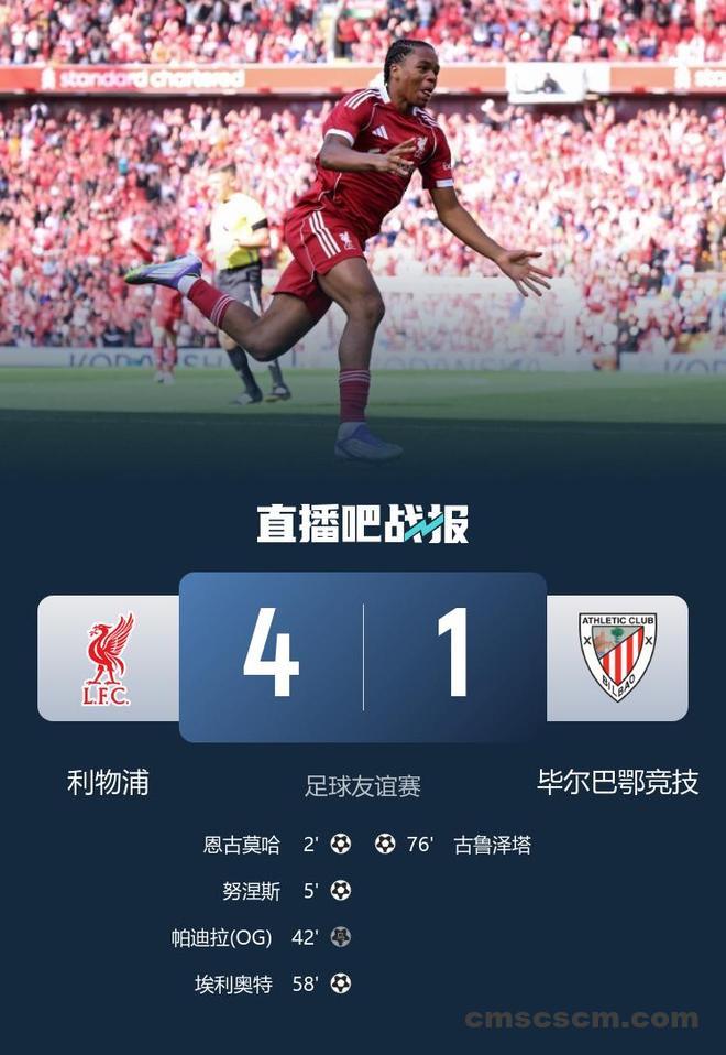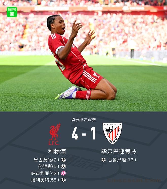 直播吧8月5日讯 北京时间00:00,足球友谊赛利物浦vs毕尔巴鄂竞技第一场打响!上半场,恩古莫哈一条龙破门,随后助攻努涅斯再下一城!多克小角度制造帕迪拉乌龙。下半场,努涅斯助攻埃利奥特破门!努涅斯同样完成传射;古鲁塔泽帮助毕尔巴鄂竞技扳回一球。最终利物浦在第一场与毕巴的友谊赛中4-1取胜,双方将在北京时间3:00进行第二场对决。