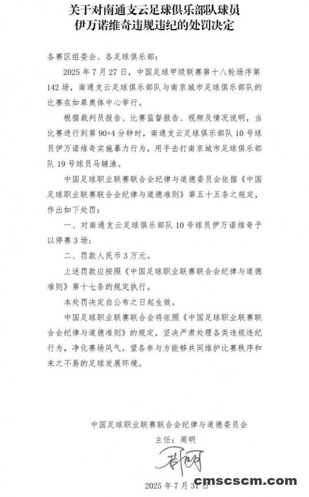 直播吧7月31日讯 南通支云外援伊万诺维奇因暴力行为,被中足联禁赛3场、罚款3万。 中甲第18轮南通支云主场对 […]