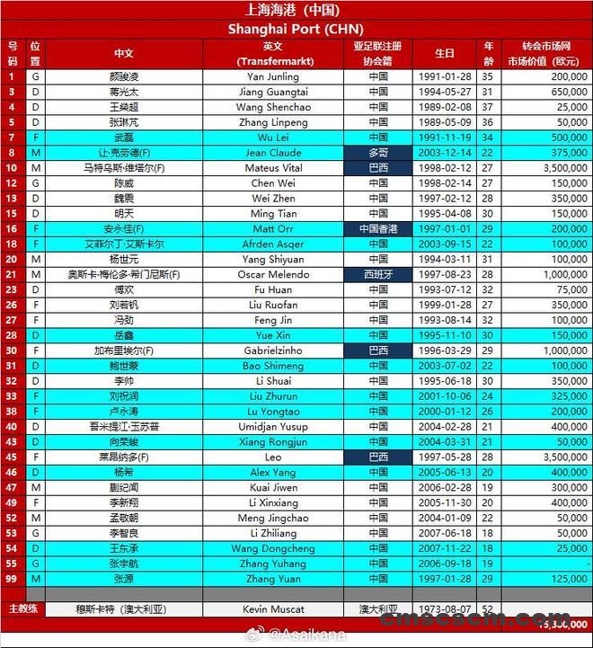 北京时间2月10日,德国转会市场亚洲区管理员朱艺 公布了上海海港队的亚冠名单,其中武磊回归,新援安永佳、杨希、克劳德等人在列。