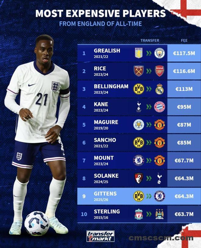北京时间7月5日,切尔西官方宣布从多特蒙德签下英格兰边锋吉滕斯。在这笔交易完成后,德国转会市场列出了英格兰球员转会费排行榜。其中,三名球员转会费破亿,吉滕斯转会切尔西位列第九。