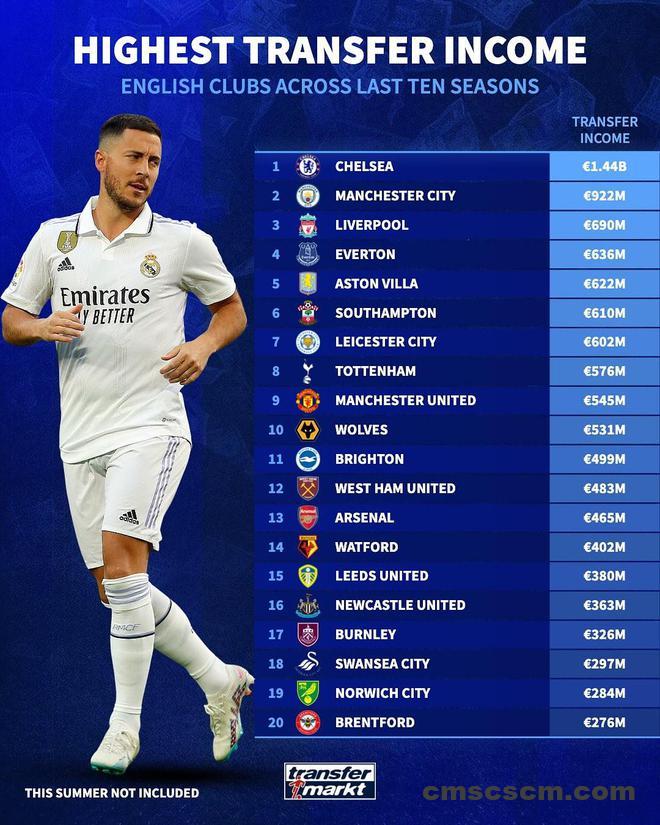 德国转会市场网站列出了英格兰俱乐部近10个赛季转会收入榜,切尔西以14.4亿欧居首,曼城第二,利物浦第三。