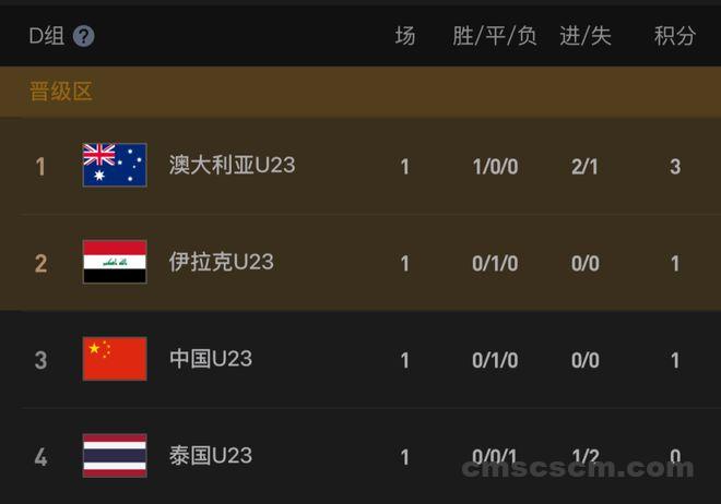 小组首轮,U23国足0-0战平伊拉克,而澳大利亚2-1逆转十人泰国。首轮战罢,澳大利亚3分领跑,伊拉克1分小组第2,U23国足同积1分,但因为多吃1张黄牌屈居第3,而泰国队0分垫底。