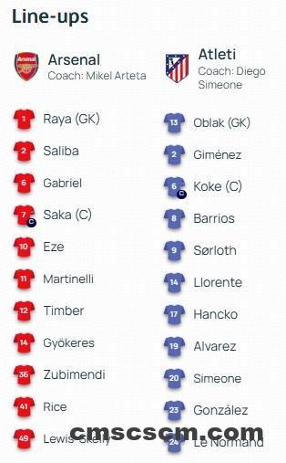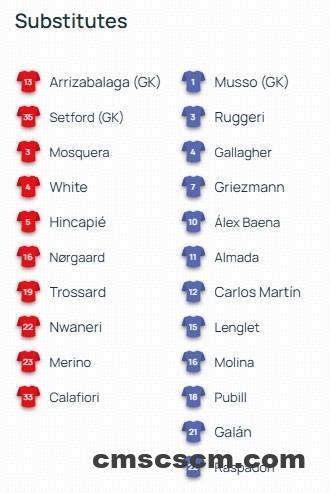 阿森纳首发:1-戴维-拉亚、2-萨利巴、6-加布里埃尔、7-萨卡、10-埃泽、11-马丁内利、12-廷贝尔、14-哲凯赖什、36-苏比门迪、41-赖斯、49-刘易斯-斯凯利