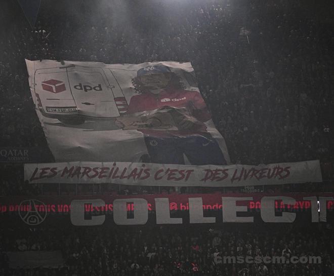 他所指责的,是出现在奥特尔看台左上方的一条横幅,该画面在社交网络上广泛传播。画面中,一名DPD快递员头戴马赛队帽、身穿切尔西运动裤,手中拿着一个画有老鼠的纸箱。Tifo配文写道:“马赛人,都是快递员。(Les Marseillais, c’est des livreurs)”