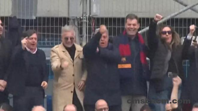 Esport3电视台的镜头捕捉到了极具戏剧性的一幕:当全场球迷齐声高唱那首著名的加泰罗尼亚语助威歌——“Boti, boti, boti, madridista qui no boti”(意为“跳起来,跳起来,不跳的就是皇马人”)时,拉波尔塔兴奋地站起身,随着节奏在座位上尽情跳跃。他不仅大声跟唱,还对着镜头做出了一个争议性的“打伞”手势,神情激昂,瞬间点燃了周围的气氛。
