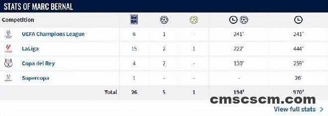 本赛季贝尔纳尔复出之后,已经为巴萨在各项赛事中出战26场,一共踢了970分钟。弗里克最初对他的使用非常耐心,直到德容受伤后,才让贝尔纳尔重新成为先发,出任球队后腰。