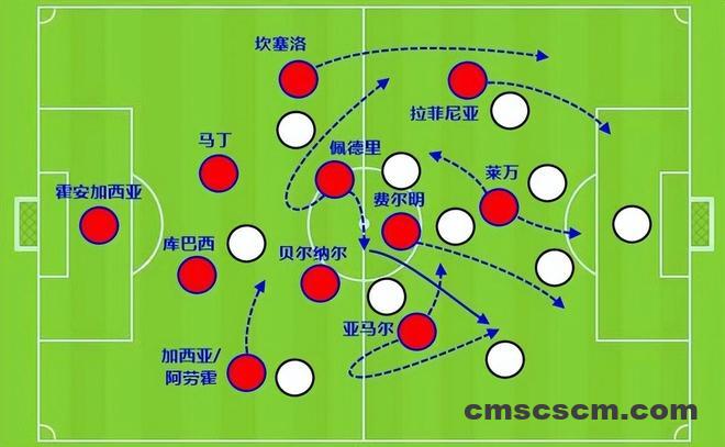 关键点还是因为有了佩德里,通过后者拖后,一来保证传球和推进的稳定性,二来也能做好攻防转换时的选位,这样一来,贝尔纳尔利用自己阅读比赛和洞察空间的能力适时前插,可以起到不错的效果。