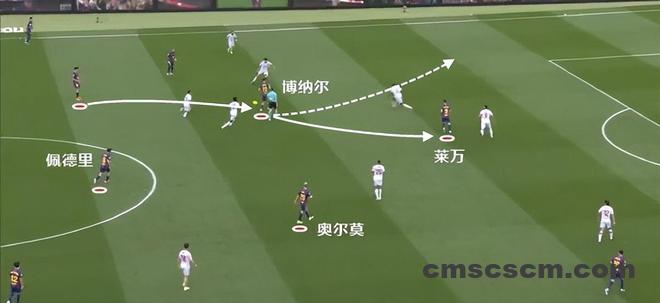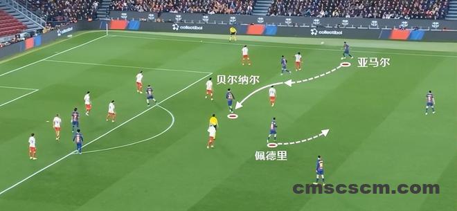 虽然之后皮球没有给到贝尔纳尔这一侧,不过通过佩德里的传球找到了中路奥尔莫的机会。