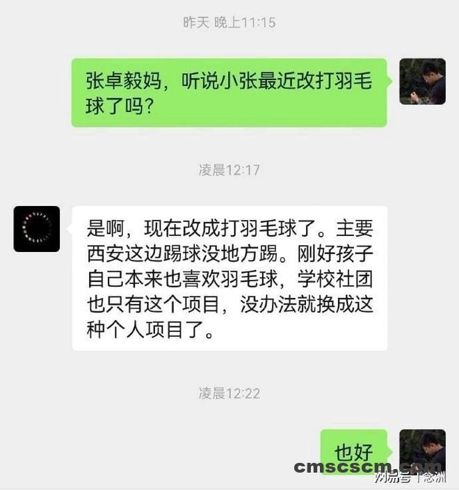 然而据10号沛沛最新透露,张卓毅的家长明确表示,孩子已经改打羽毛球了,主要是因为西安这边踢球没地方踢。刚好孩子自己本来也喜欢羽毛球,学校社团也只有这个项目,没办法就换成这种个人项目了。