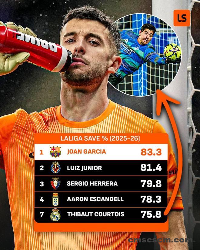 巴萨门将霍安-加西亚目前以83.3%的扑救成功率位居首位,紧随其后的是比利亚雷亚尔的路易斯-儒尼奥尔,成功率为81.4%,两人也是目前唯二扑救成功率超过80%的门将。