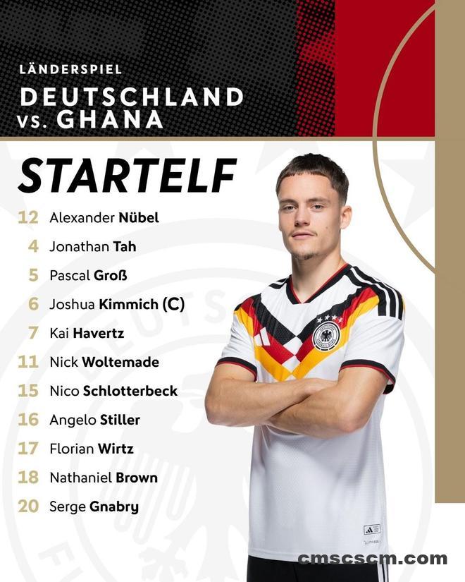 德国首发: 12-努贝尔、4-约纳坦-塔、5-格罗斯、6-基米希、7-哈弗茨、11-沃尔特马德、15-施洛特贝克、16-施蒂勒、17-维尔茨、18-纳撒尼尔-布朗、20-格纳布里