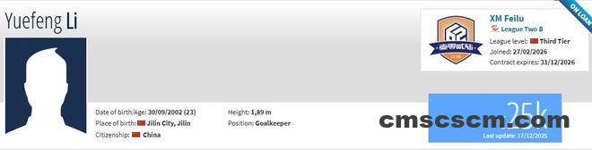 李岳峰现年23岁,司职门将,在2022赛季加盟天津津门虎,目前共为球队出场2次,均完成零封。现在他在德转上的身价为2.5万欧。