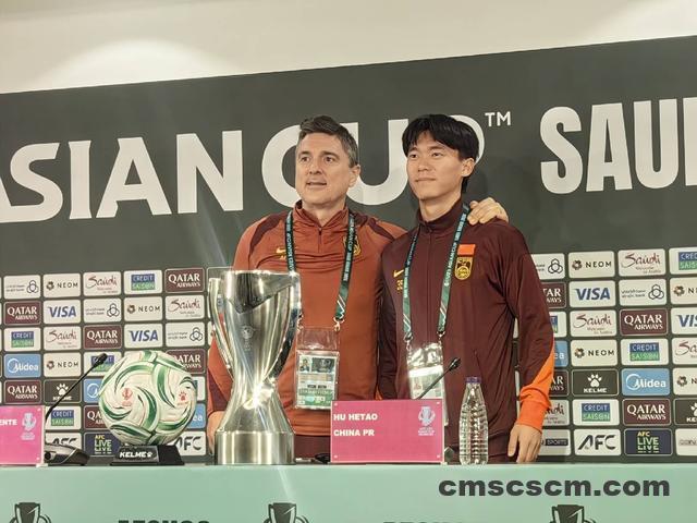 懂球帝记者 现场报道,北京时间1月23日,U23亚洲杯决赛中国vs日本的赛前新闻发布会在吉达阿卜杜拉–费萨尔王子体育场进行。中国队主教练安东尼奥携球员胡荷韬出席。