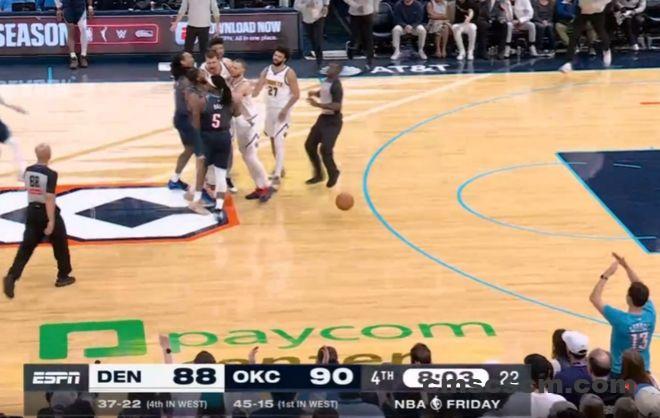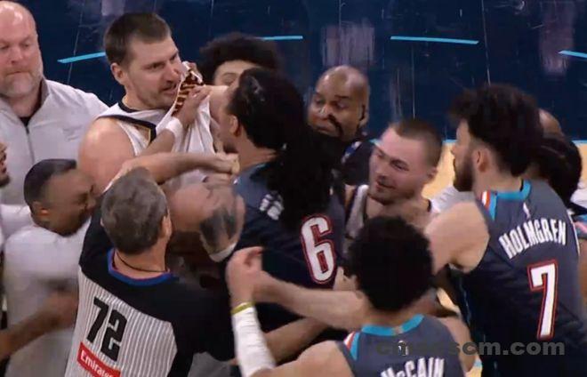 雷霆球员杰林冲上去帮队友多尔特出头,他与约基奇推搡互相撕扯球衣,双方多位球员围拢在一起爆发冲突。