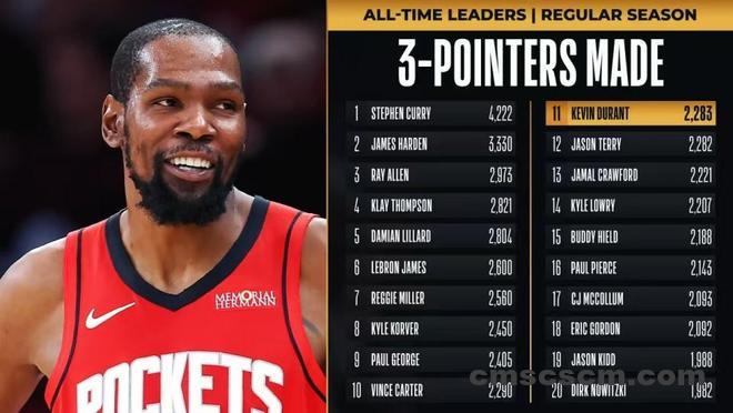 杜兰特NBA生涯常规赛三分命中数超越杰森-特里,升至历史第11位迎来里程碑,前一位是飞人卡特。