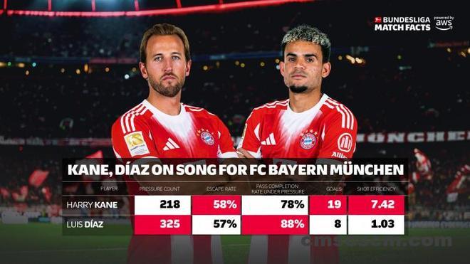 第一轮国家德比前,德甲官方数据AWS就曾强调指出:路易斯·迪亚斯在压力下极为冷静。在本赛季的127次压迫情境中,迪亚斯成功摆脱了其中的60%。更令人印象深刻的是,在压迫下,这位哥伦比亚人的传球成功率高达86%(数据截止2025年10月17日)。