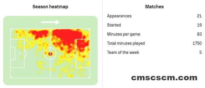 如果现在再回看迪亚斯的参与进球和参与制造得分机会完整点位图,你会发现,迪亚斯最有威胁的时间主要集中在下半场前半段和后半段,这两个足球比赛尤为关键的时期。本赛季,拜仁在落后或胶着的比赛中,迪亚斯贡献7球4助,独造11球,占球队胶着局进球数的42%。迪亚斯的所有数据,都是在全德甲所有球员压力值最大的情况下取得的,即便这样他也竟然也值是本赛季德甲场均评分第二的左边锋,但所有数据都能证明迪亚斯有一颗大心脏。