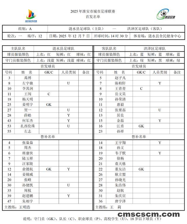 2025年淮安市城市足球联赛 涟水县VS洪泽区 首发名单公布 涟水队加油! 洪泽区队加油! 芒果体育新闻中心 芒果体育-最权威热门的全球体育赛事直播平台新闻中心 好消息!曝辽宁铁人与中场核心续约,单赛季5球18助,国籍引争议 戴维斯29+8独行侠终结火箭2连胜,弗拉格19+5杜兰特27分