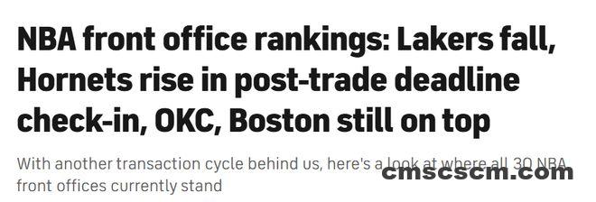 北京时间2月18日,知名美媒CBS对联盟30队的管理层进行了排名,其中雷霆管理层居首,凯尔特人第2,火箭第3,骑士第5,勇士第17,湖人第25,国王垫底。具体排名如下: