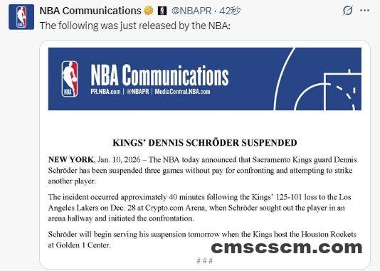 北京时间1月11日,NBA官方今日宣布,萨克拉门托国王队后卫丹尼斯-施罗德因与另一名球员发生对峙并试图动手击打对方,被处以禁赛三场且无薪的处罚。