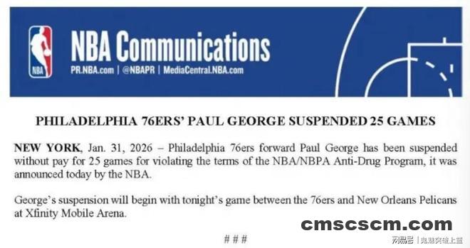 北京时间2月1日讯,NBA官方宣布,费城76人前锋保罗-乔治因违反联盟禁药政策,他将被禁赛25场。