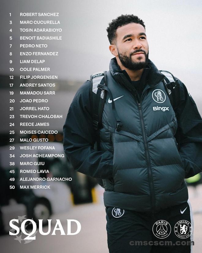 切尔西官方公布了欧冠1/8决赛首回合客战巴黎圣日耳曼的比赛大名单,帕尔默领衔,埃斯特旺、吉滕斯缺阵。