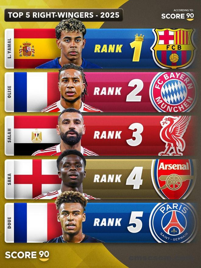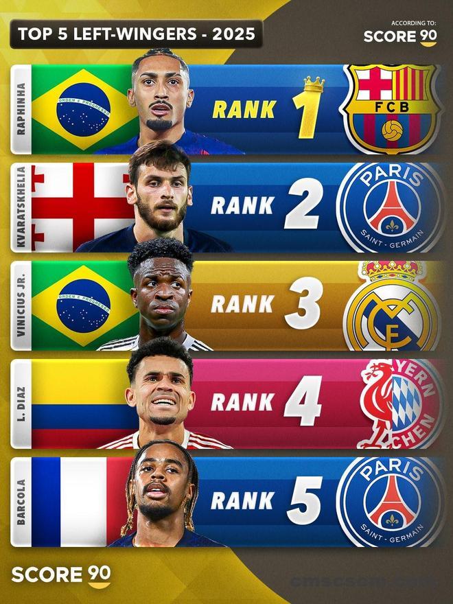 北京时间12月31日,Score90公布了根据他们的数据统计选出的2025年五大前锋,其中左边锋第一是拉菲尼亚, 右边锋第一是亚马尔,中锋第一是姆巴佩。